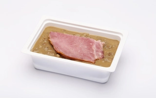 lencse(58.83%), TEJFÖL (TEJ)*, MUSTÁR (ivóvíz, MUSTÁRMAG, ecetsav, cukor, étkezési só, fűszerek, kálium-szorbát)*, kristálycukor, BÚZALISZT(GLUTÉN)*, sertés kenyérszalonna, vöröshagyma, füstölt húsízesítő (Étkezési só, keményítők, füstölt szalonna 4%, főtt-szárított sertéshús 4%, pirított vöröshagymapor, fokhagymapor, aromák, maltodextrin, cukor, növényi zsír, élesztőkivonat, zöldség- és gyümölcslé koncentrátum (vöröshagyma, alma, sárgarépa), fűszerek (babérlevél, fűszerpaprika, lestyán, bors), színezék (karamell-ammóniás), füstaroma, füstölt szalonna kivonat, növényi olaj, antioxidáns), fokhagyma, só, ecet, ételízesítő (Jódozott étkezési só (étkezési só, kálium-jodid), ízfokozó E621 és E631, cukor, karotta, pasztinák, vöröshagyma, petrezselyem, bors, színezőanyag: riboflavin))*, fûszerpaprika, babérlevél