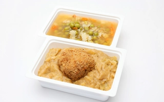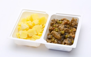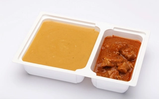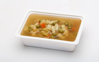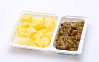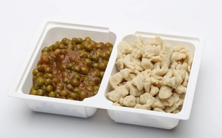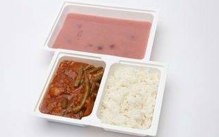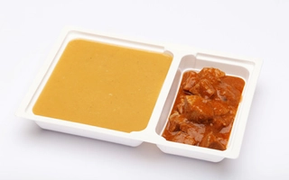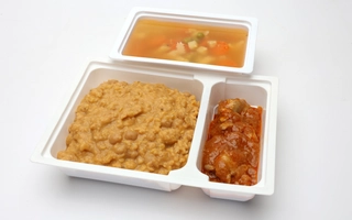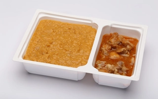 Vöröslencsés csicseriborsó főzelék: 360-400 g, csirkecombpörkölt: 135-150 g