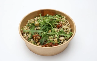fehérbab konzerv (fehérbab, víz, só)(19.76%), hántolt köles(19.76%), sárgarépa(14.82%), aszalt paradicsom olajban (szárított paradicsom 58%, napraforgó olaj, borecet(bor, víz), só, oregánó, chilis paprika, fokhagyma, sav.szab.anyag:E330, antioxidáns:L-aszkorbinsav)(12.35%), zöld olajbogyó(9.88%), ruccola(9.88%), olívaolaj, lilahagyma, citromlé 100%, petrezselyem, fekete bors, só