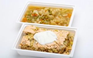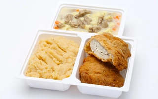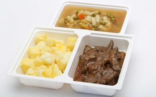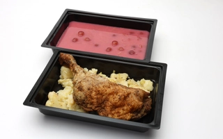Meggyes rebarbara krémleves: 360-400 g, Pirított csirkecomb: 162-180 g, póréhagymás törtburgonya : 108-120 g
